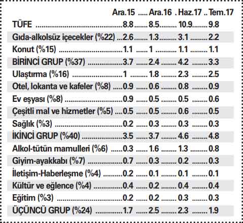 Tabloda da görüldüğü üzere enflasyonda temmuzda görülen 1,1 puanlık düşüşün 0,9 puanı gıdadan gelmiş. Ulaştırma, turizm ve hizmetler (otel, lokanta ve kafe), ev eşyası, kültür ve eğlence ve de eğitim gibi çoğunlukla hizmet harcamalarına ilişkin gruplarda enflasyonda yükselme eğilimi var. Buna karşılık alkol ve tütün mamulleri grubunda yıllık enflasyon yüzde 21,7’den yüzde 14,1’e gerilemiş. Bu da enflasyondaki düşüşe 0,5 puan yardım etmiş.