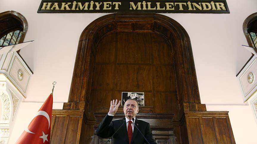 Başkan Erdoğan, geçmişte eski TBMM binasının sıralarında devleti kurtarmak ve istiklali sağlamak için bir araya gelindiğine işaret ederek, "Bugün ise Türkiye'yi 2023 hedeflerine ulaştırarak dünyanın en büyük 10 ekonomisinden biri haline getirmenin kararlılığıyla buradayız. Evlatlarımızın da 2053 ve 2071 vizyonlarını hayata geçirdiklerinde milletimizle sevinçlerini yine burada bu çatı altında paylaşacaklarına inanıyorum." değerlendirmesinde bulundu.