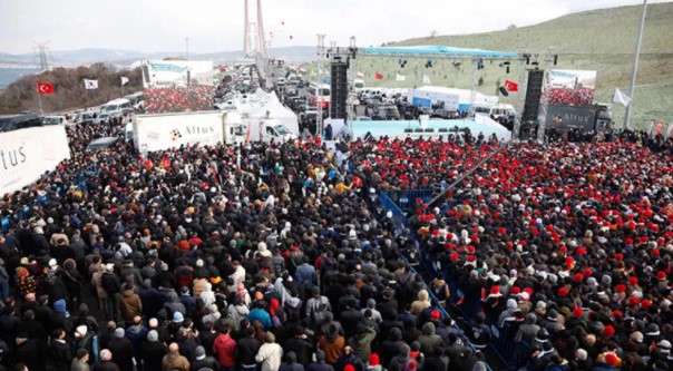 Hastaneleri böyle yapıyoruz, yolları böyle yaptık yapıyoruz ve yapmaya da devam edeceğiz. Sağladığı zaman, yakıt, emisyon kazançları yanında hayata geçirildiği bölgelerde yol açtığı ekonomik ve sosyal ivmelerle bu projeler Türkiye'nin kalkınmasına çok önemli destekler vermektedir. Küresel ekonomik sistemin yeni baştan düzenlendiği şu dönemde ülkemizin yatırım, insan gücü, üretim, ihracat potansiyeli ile öne çıkmasında bu projelerin payı çok büyüktür. Bu modele karşı çıkanlara sadece ülkenin kalkınması için gereken yatırımları yapma konusunda hangi teklifleri olduğunu sorun. Bu soru tek başına onların ne derece boş konuştuklarını, ne derece hazırlıksız, ne derece riyakar olduklarını göstermeye yetecektir. Biz burada sadece Boğaz'ın iki yakası arasındaki bir köprüyü hizmete açmıyoruz. Biz burada Türkiye'nin bugünü ile geleceği arasında daha da güçlenen bir kalkınma köprüsünü açıyoruz. Biz burada Türkiye'nin büyüme, güçlenme, gelişme bölgesinde ve dünyada huzurun, refahın, adaletin, hakkaniyetin sembolü haline gelme vizyonunun yeni bir halkasına kavuşuyoruz.