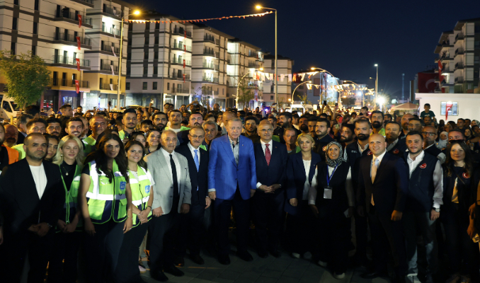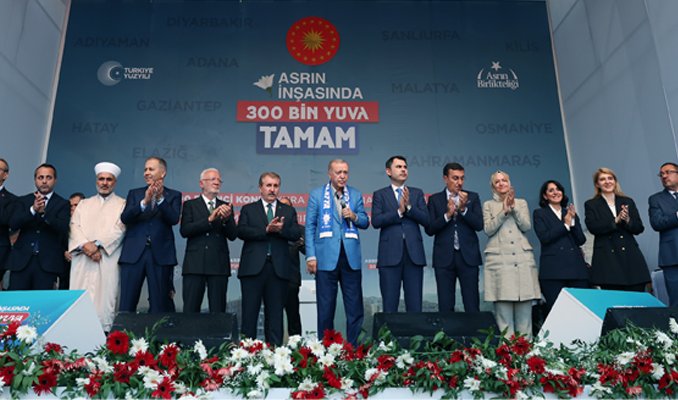 Ocak ayında 200, haziran ayında ise 250 bininci konutların depremzedelere teslim edildiğini hatırlatan Erdoğan, “Deprem bölgemizdeki 5 ilimizde Diyarbakır, Gaziantep, Kilis, Osmaniye ve Adana'da anahtarların çok önemli bir kısmı hak sahiplerine teslim edildi. Malatya, Kahramanmaraş, Hatay, Adıyaman, Şanlıurfa ve Elazığ'da çalışmalarımız son sürat devam ediyor. İşte bugün Malatya'da 300 bininci konutun anahtarını teslim ediyoruz. ‘Hükümet bu enkazın altında acaba ne zaman kalacak’ umuduyla tam 2 buçuk yıldır bekleyen deprem turistlerini işte bir kez daha hüsrana uğratıyoruz. Şunu da büyük bir gururla ifade etmek isterim bugün itibariyle deprem bölgesindeki her 3 hak sahibi vatandaşımızdan ikisini yeni yuvasına kavuşturmuş oluyoruz. Bugüne kadar 13 ilimizde 295 bin 929'u konut ve 8 bin 907'si iş yeri olmak üzere toplam 304 bin 836 bağımsız bölümü hak sahibi vatandaşlarımıza veriyoruz. İnşallah yılbaşına kadar deprem bölgemizde 453 bin bağımsız bölümü tamamlamak niyetindeyiz. Yeni evine, yeni iş yerine kavuşmamış tek bir vatandaşımız kalmayana kadar yılmadan, yorulmadan çalışacağız” dedi.