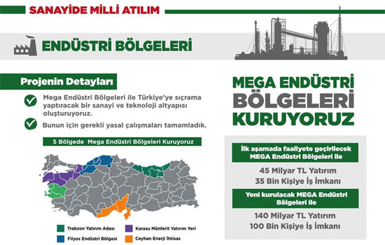 Ayrıca, görselde, Türkiye haritası üzerinde, kurulacak "Trabzon Yatırım Adası", "Karasu Münferit Yatırım Yeri", "Filyoz Endüstri Bölgesi", "Ceyhan Enerji İhtisas" mega endüstri bölgeleri gösterildi. Haritada Ege Bölgesi'nde de mega endüstri merkezi kurulacağı bilgisi yer aldı.