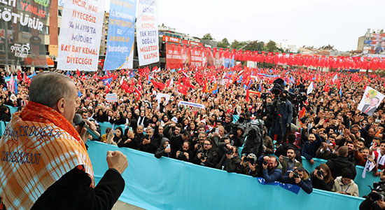 Alana asılan "Önce Yassıada'da şimdi masada 6'sı bir arada biri de masanın altında. Oyunu bozalım gari Efem." yazılı pankartı okuyan Erdoğan, alandakilere, "Efeler, oyunu bozmaya hazır mıyız?" diye sordu. Alandakilerin hep bir ağızdan "evet" karşılığını vermesinin ardından Erdoğan, "Bugün Ege'mizin güzide merkezi Nazilli'de sizlerle olmaktan büyük memnuniyet duyuyorum. Biraz önce Aydın bir başka coşkuluydu. Aydın'da toplu açılış törenini yaptık. Oradaki kardeşlerimizle coşkulu bir buluşma gerçekleştirdik. Tabii Aydın'a gelmişken Nazilli'ye uğramadan gidilir mi?" ifadesini kullandı.