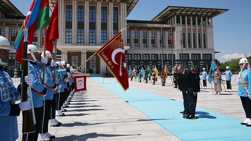 Aliyev, Muhafız Alayı Tören Kıtası'nı "Merhaba asker" diyerek selamladı. Törende, tarihte kurulan 16 Türk devletini temsil eden bayraklar ve askerler de yer aldı.