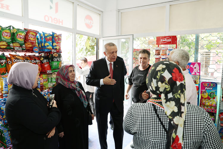 Cumhurbaşkanı Erdoğan, güzergahtaki bir bakkala girdi. İş yerindeki müşteriler ve çevredeki vatandaşlarla sohbet eden Erdoğan, esnafa "Hayırlı kazançlar" diledi.