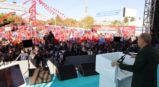 Alana asılan, "Diyarbakır etrafında bağlar var, altılı masa size buradan mesaj var. Sahiplerinize fırsat vermeyeceğiz, Kürtleri masanıza meze etmeyeceğiz." pankartını da okuyan Cumhurbaşkanı Erdoğan, şöyle devam etti: