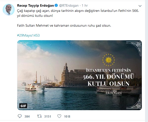 Cumhurbaşkanı Recep Tayyip Erdoğan, sosyal paylaşım sitesi Twitter'daki hesabından yaptığı ve İstanbul'un bazı tarihi yapılarının görsellerinin de yer aldığı paylaşımında, "Çağ kapatıp çağ açan, dünya tarihinin akışını değiştiren İstanbul’un Fethi’nin 566. yıl dönümü kutlu olsun! Fatih Sultan Mehmet ve kahraman ordusunun ruhu şad olsun." ifadelerini kullandı.