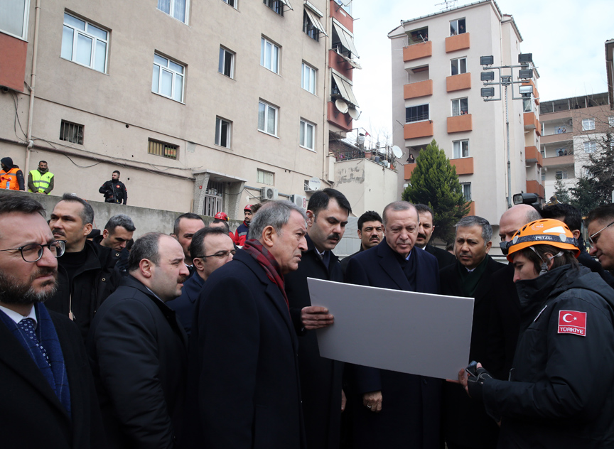 İçişleri Bakanı Süleyman Soylu, Çevre ve Şehircilik Bakanı Murat Kurum, Sağlık Bakanı Fahrettin Koca, İstanbul Valisi Ali Yerlikaya ve Büyükşehir Belediye Başkanı Mevlüt Uysal tarafından karşılanan Cumhurbaşkanı Erdoğan, daha sonra enkazın bulunduğu alana geçti.