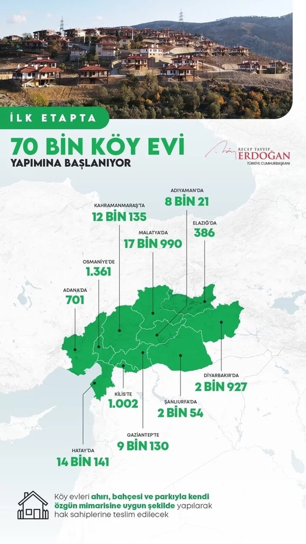Bir müjde de köylerimizde yaşayan vatandaşlarımıza vermek istiyorum. Şehirlerde olduğu gibi köylerde de 1 yılda ayağa kaldırma çalışmasını yapacağız.