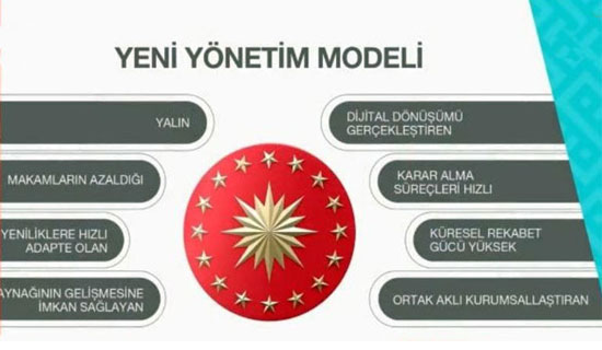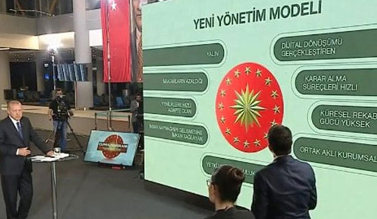Cumhurbaşkanlığı Hükümet Sistemi ile bu engelleri bir defa ortadan kaldırmayı hedefliyoruz. Kendi tarihimizi ve dünyadaki modelleri inceledik. Yeni modeli oluştururken kendi sorunlarımızı masaya yatırdık. Bizim sorunalrımzı diğer ülkelerden farklı görünüyor. Bu modele Türkiye modeli dedik. Çok eleştiri aldım. Varsın alayım. Patenti bize ait. Bakanlık sayısını 16'ya indiriyoruz. Dışişleri Bakanlığı AB Bakanlığı ile birleşiyor. Orman Bakanlığı ile Tarım Bakanlığı birleşiyor. Ekonomi yönetimi sadeleşmiş oluyor, 6 olan bakanlık sayısını 3'e indiriyoruz" dedi.