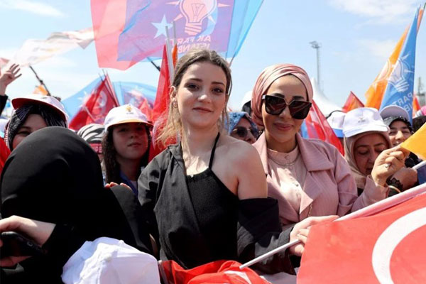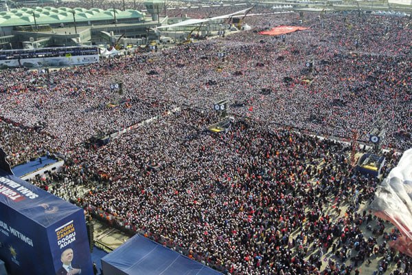 AK Parti'nin, Atatürk Havalimanı Millet Bahçesi'nde düzenlediği "Büyük İstanbul Mitingi"ne katılan ve eşi Emine Erdoğan ile beraber sahneye çıkan Cumhurbaşkanı Erdoğan, vatandaşları selamlarken, Cengiz Kurtoğlu'nun "Duyanlara Duymayanlara" şarkısına eşlik etti.