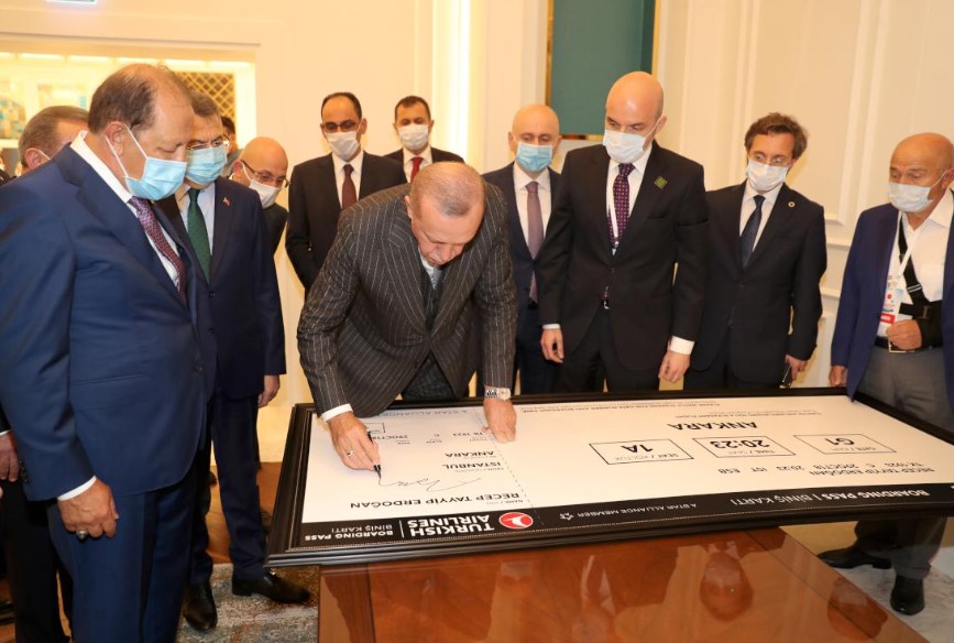 "Havalimanımız, ihtiyaç halinde yıllık 200 milyon yolcuya kadar geliştirilebilecek bir planlamayla inşa edildi. Salgın sebebiyle verilen arayı bir kenara bırakarak ifade etmek gerekirse İstanbul Havalimanı'ndan neredeyse ulaşılamayacak hiçbir önemli merkez bulunmuyor. Kullanan herkesin hayranlığını dile getirdiği havalimanımızın devreye girmesiyle adeta küresel ve bölgesel hava ulaşımında yeni bir dönem başladı. Öyle ki pek çok ülke, mevcut havalimanlarının durumlarını ve yeni havalimanı yatırımlarını gözden geçirmek zorunda kaldı. Kimi ülkeler geçmişten gelen sömürge birikimleri, kimi ülkeler zahmetsizce elde ettikleri doğal kaynak gelirleriyle büyürken, biz kendi kalkınma modellerimizi kendimiz oluşturuyoruz."