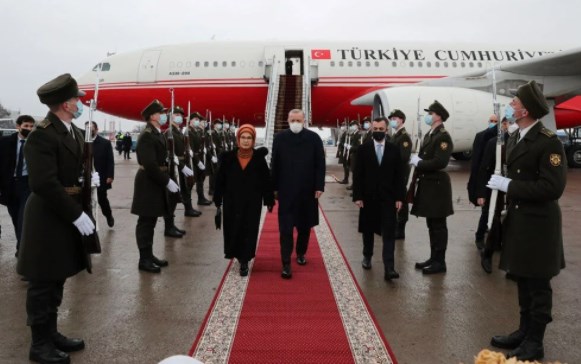 Ukrayna Devlet Başkanı Zelenskiy, Cumhurbaşkanı Erdoğan'ı kapıda karşıladı. İki lider tokalaşmanın ardından ayaküstü bir süre sohbet etti. Erdoğan, Türkiye ve Ukrayna milli marşlarının seslendirilmesinin ardından karşılama kıtasını selamladı.