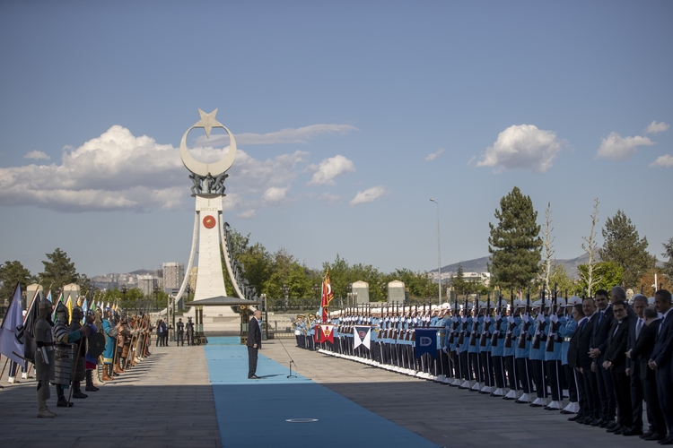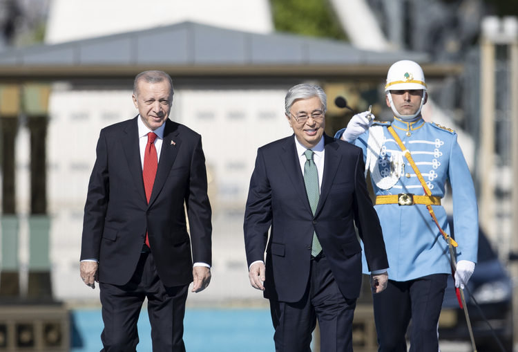 Erdoğan ve Tokayev'in tören alanındaki yerlerini almalarının ardından, 21 pare top atışı eşliğinde iki ülke milli marşları çalındı. Tokayev, Muhafız Alayı Tören Kıtası'nı, Türkçe "Merhaba asker" diyerek selamladı.