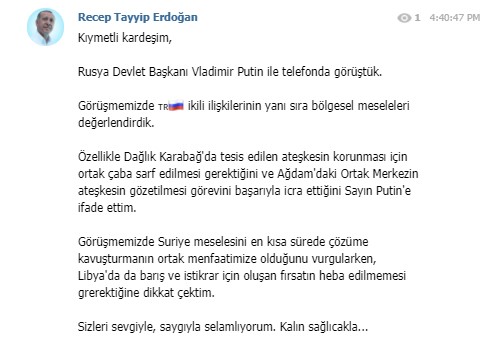 Cumhurbaşkanı Erdoğan, görüşmede Dağlık Karabağ’da 11 Ocak Mutabakatı’nı takiben yeniden tesisi için çalışmaların sürdüğü kara ve demiryolu ulaştırma hatlarının daha verimli olması için Türk ve Rus uzmanların Azerbaycanlı muhataplarıyla bir araya gelebileceğini ifade etti.