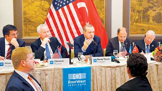 Cumhurbaşkanı Recep Tayyip Erdoğan’ın, ABD’li bazı küresel şirket ve kurumların üst düzey yöneticileriyle bir araya geldiği toplantıda, Türkiye’deki yatırım fırsatları ve yapılan reformlar ele alındı. EastWest Enstitüsü’nün ev sahipliğinde, Başbakanlık Türkiye Yatırım Destek ve Tanıtım Ajansı (TYDTA) koordinasyonuyla düzenlenen toplantıya ilişkin yapılan açıklamada, Cumhurbaşkanı Erdoğan’ın Birleşmiş Milletler’in (BM) 72. Genel Kurul için gittiği ABD’nin New York kentinde bilişim, ilaç, havacılık, gıda, finans ve enerji başta olmak üzere birçok sektörde faaliyet gösteren firmaların 70’e yakın üst düzey temsilcileriyle bir araya geldiği belirtildi.