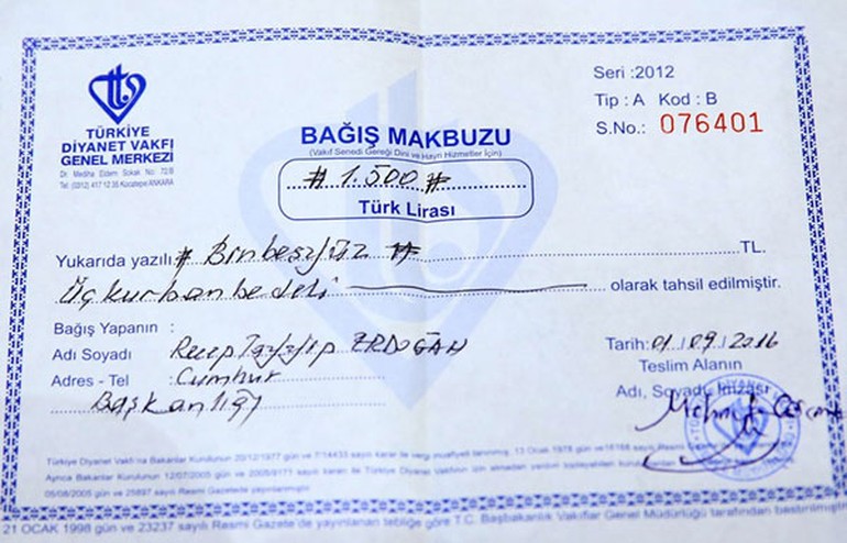 Cumhurbaşkanı Erdoğan, Diyanet Vakfı’na bin 500 liralık kurban bağışında bulundu. Cumhurbaşkanlığı, bağışa ait makbuzu Cumhurbaşkanlığı sitesinden yayınladı.