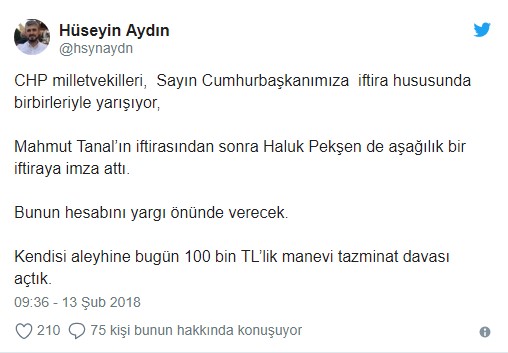 "CHP milletvekilleri, Sayın Cumhurbaşkanımıza iftira hususunda birbirleriyle yarışıyor. Mahmut Tanal’ın iftirasından sonra Haluk Pekşen de aşağılık bir iftiraya imza attı. Bunun hesabını yargı önünde verecek. Kendisi aleyhine bugün 100 bin TL’lik manevi tazminat davası açtık."