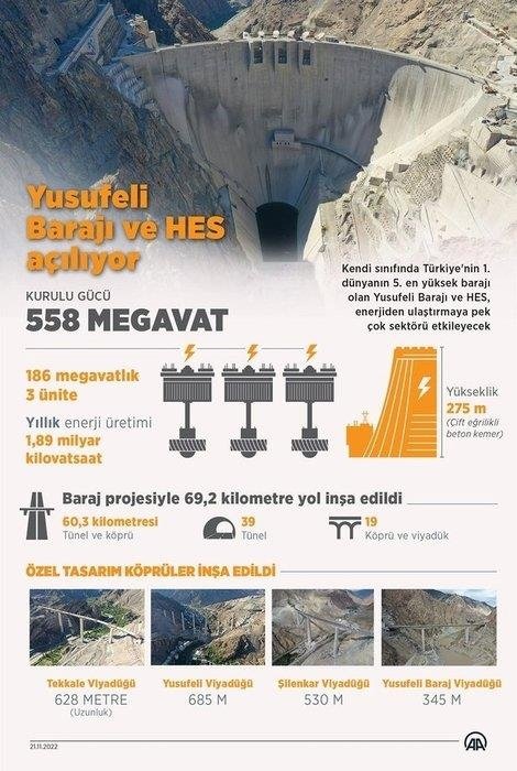 Allah göstermesin bir enerji sıkıntısı olsa sadece burası 1,5 yıl enerjiyi temin eder. Bu baraj, aynı zamanda Çoruh Nehri'nin devamındaki Artvin, Deriner, Borçka ve Muratlı barajlarının en yüksek verimle çalışmasını sağlayacaktır. Su depolama kapasitesi 2,3 milyar metreküp olan Yusufeli Barajı'nın enerji üretim kapasitesi 2,5 milyon konutun veya 750 bin Togg otomobilinin enerji ihtiyacını tek başına karşılayacak düzeydedir.