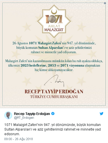 Cumhurbaşkanı Erdoğan, 1071 Malazgirt Zaferi'nin 947. yıl dönümü dolayısıyla Twitter hesabından paylaşımda bulundu.