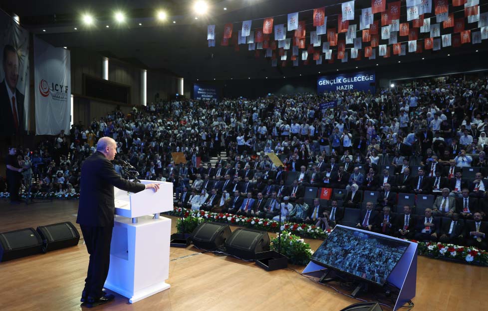 Programa katılan gençlerin tuttuğu "İri olacağız, diri olacağız, hep birlikte güçlü olacağız." pankartını okuyan Erdoğan, konuşmasının devamında "İslam dünyası olarak zorlu bir süreçten, çetin bir imtihandan geçiyoruz. Savaş, çatışma, kaos ve istikrarsızlık bulutları medeniyet coğrafyamızın semalarını maalesef kaplamış durumda." dedi.