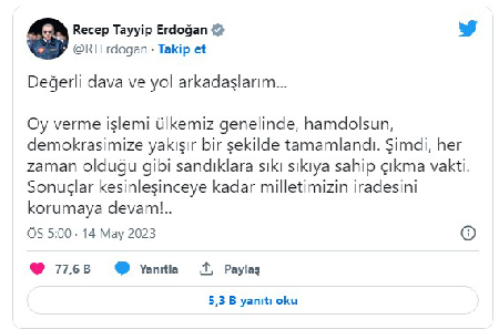 Cumhurbaşkanı Erdoğan, sosyal medya hesabından, Cumhurbaşkanı ve 28. Dönem Milletvekili Genel Seçimleri için yurt genelinde oy verme işleminin tamamlanmasının ardından paylaşım yaptı.