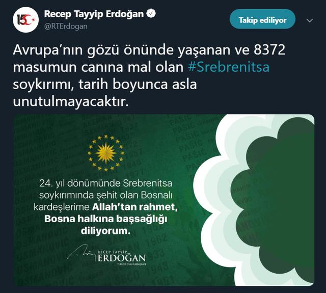 "24’üncü yıldönümünde Srebrenitsa soykırımında şehit olan Bosnalı kardeşlerime Allah'tan rahmet, Bosna halkına başsağlığı diliyorum. Avrupa’nın gözü önünde yaşanan ve 8 bin 372 masumun canına mal olan Srebrenitsa soykırımı, tarih boyunca asla unutulmayacaktır."