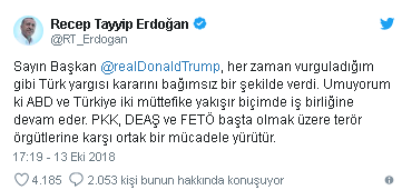 Cumhurbaşkanı Erdoğan, Twitter hesabından Trump'a seslendi. Erdoğan, ''Sayın Başkan @realDonaldTrump, her zaman vurguladığım gibi Türk yargısı kararını bağımsız bir şekilde verdi. Umuyorum ki ABD ve Türkiye iki müttefike yakışır biçimde iş birliğine devam eder. PKK, DEAŞ ve FETÖ başta olmak üzere terör örgütlerine karşı ortak bir mücadele yürütür.'' dedi.
