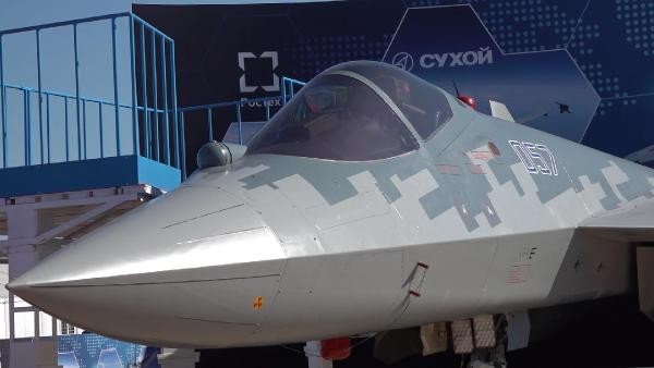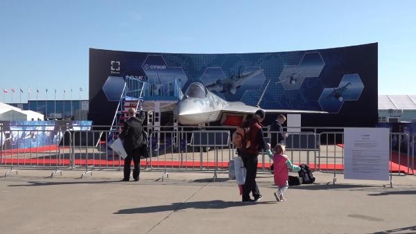 Dünkü açılış töreninde Rusya Devlet Başkanı Vladimir Putin, beşinci nesil Rus Su-57 savaş uçağını, Cumhurbaşkanı Erdoğan’a anlatmıştı. DHA ekibi, fuarda sergilenen Su-57 savaş uçağını yakından görüntüledi.