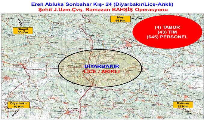 Bu kapsamda, terör örgütü PKK'yı ülke gündeminden çıkarmak ve bölgede barındığı değerlendirilen teröristleri etkisiz hale getirmek amacıyla Diyarbakır'da "Eren Abluka Sonbahar-Kış-24 (Diyarbakır/Lice-Arıklı) Şehit Jandarma Uzman Çavuş Ramazan Bahşiş Operasyonu" başlatıldı.