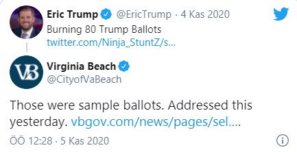 Eric Trump’a Twitter’dan yanıt veren Virginia Beach yetkilileri, oy pusulalarının örnek olduğunu söyledi ve “Bu konuyu dün açıkladık” dedi.