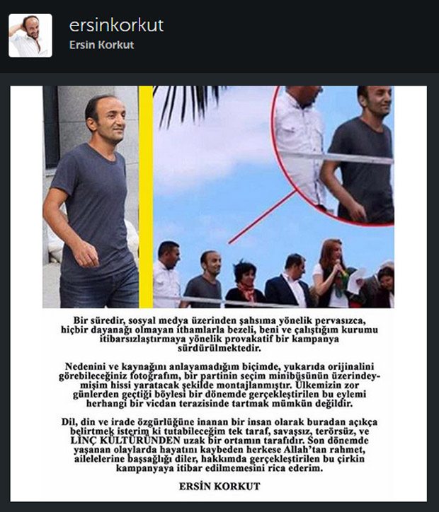 "Bir süredir, sosyal medya üzerinden şahsıma yönelik pervasızca, hiçbir dayanağı olmayan ithamlarla bezeli, beni ve çalıştığım kurumu itibarsızlaştırmaya yönelik provakatif bir kampanya sürdürülmektedir. Nedenini ve kaynağını anlayamadığım biçimde, yukarıda orijinalini görebileceğiniz fotoğrafım, bir partinin seçin minibüsünün üzerindeymişim hissi yaratacak şekilde montajlanmasıdır.