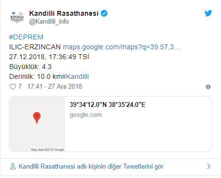 Boğaziçi Üniversitesi Kandilli Rasathanesi ve Deprem Araştırma Enstitüsü'nden yapılan açıklamada İliç'deki depremin büyüklüğü 4.3 olarak ölçüldü. Yer sarsıntısının derinliği 10 kilometre olarak ölçülürken, depremin saati 17:36 olarak belirlendi
