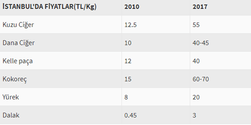 TÜİK’in dün açıkladığı verilere göre, sakatat fiyatları 5 yılda yüzde 86 artış gösterdi. Aralık 2012’de 17.65 TL olan sakatat fiyatları, Aralık 2017’de 32.87 TL’ye yükseldi. Fiyat artışları vatandaşları kokorece yöneltti. Talep artınca küçükbaş hayvan sakatatından elde edilen kokorecin fiyatı da fırladı. Canlı hayvan kesiminin azalmasının da kokoreç fiyatlarını artıran diğer bir etken olduğu kaydedildi.