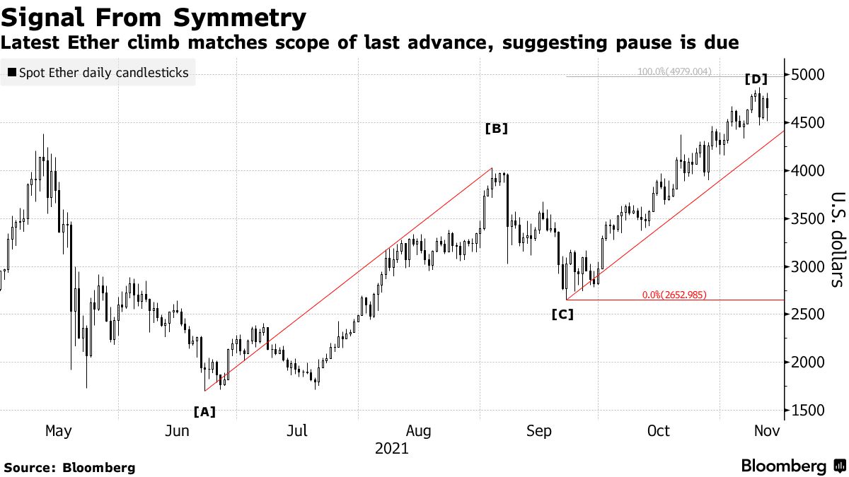 Bloomberg’in 15 Kasım tarihli haberine göre Fibonacci göstergesi, Ether fiyatındaki son rallinin haziran ve eylül ayları arasındaki ralliyle neredeyse bire bir benzerlik gösterdiğini ortaya koyuyor. Söz konusu ralli, kripto paranın düzeltmeye başlamasıyla sonuçlanmıştı.