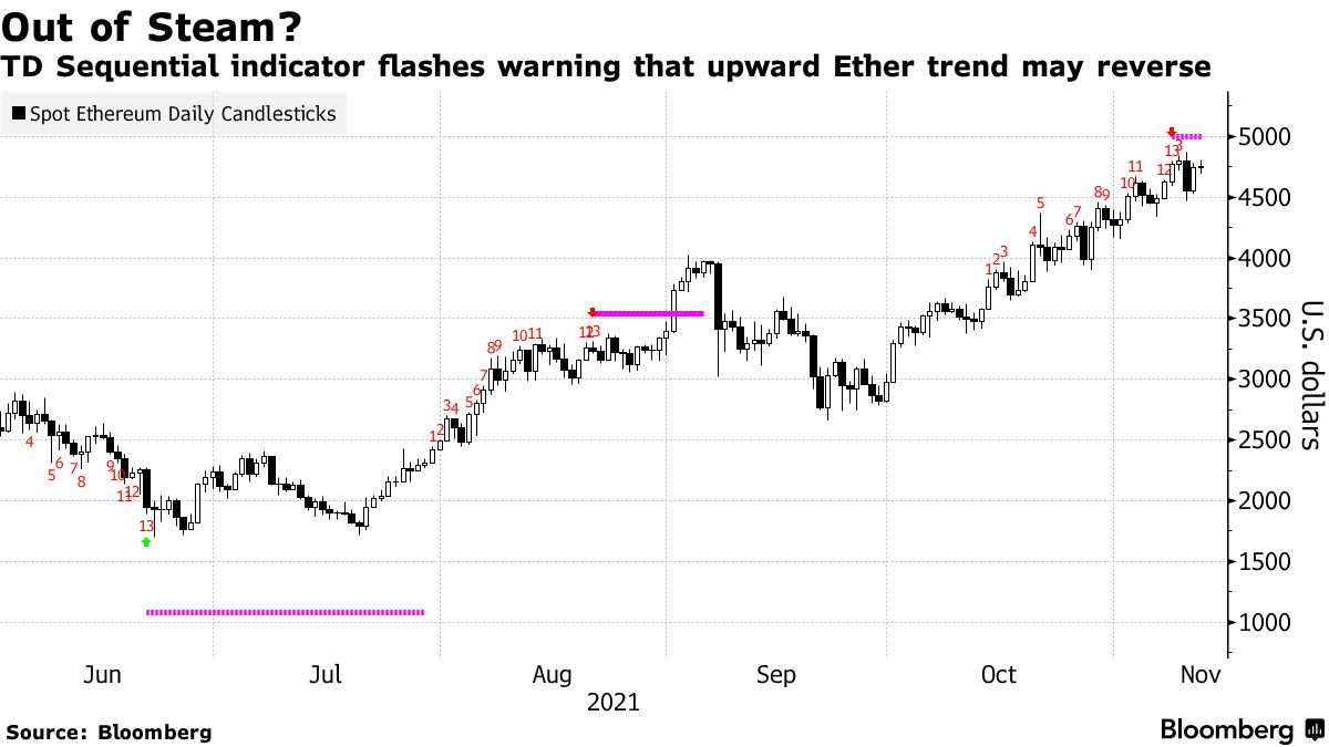 Aşağıdaki Ether grafiğinde ise önceki dört mumdan daha yüksek seviyede maksimum sayı olan 13 mumun oluştuğu görülebiliyor. Bloomberg analistlerine göre düzeltmenin habercisi olan bu durumda, ancak Ether’in 4.998 dolar seviyesini geçmesi halinde düşüş sinyali geçersiz olacak.