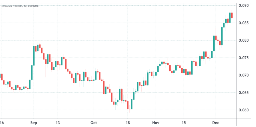 Ether (ETH) fiyatının aylardır Bitcoin'den (BTC) daha iyi performans gösterdiğini, ETH/BTC paritesinin 2021'de yüzde 230'dan fazla arttığını ve 9 Aralık'ta 0,089 değeri ile yeni bir rekor kırdığı kayıtlara geçti.