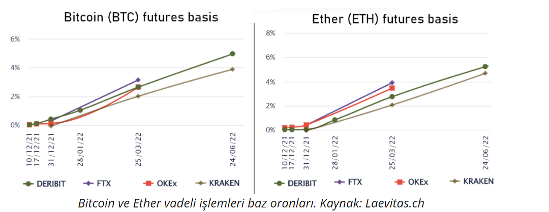 Her iki grafik karşılaştırdıktan sonra, Bitcoin vadeli işlemlerinin Mart 2022 için yıllık ortalama yüzde 2,6 ve Haziran 2022 için yüzde 4,4 oranında işlem gördüğünü görebiliriz. Bu durum, Ether'in sırasıyla yüzde 2,9 ve 5'i ile karşılaştırır. Sonuç olarak balinaların ve arbitraj masalarının Ether için daha büyük bir prim talep ettiği ortaya çıkıyor ve bu bir yükseliş göstergesi.