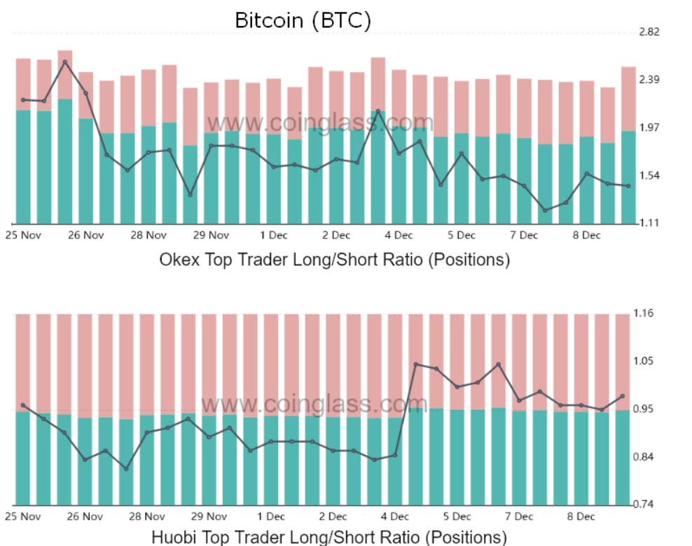 En büyük Bitcoin yatırımcılarının uzundan kısaya oranı, 5 Aralık'ta 1,39 olarak hesaplanırken şu anda 1,21 ortalama seviyesini elde etti. İki hafta önceki 1,59 değeri ile karşılaştırıldığında, bu durum, alıcıların (uzun vadeli yatırımcılar) risklerini yüzde 24 oranında azalttığına işaret ediyor.
