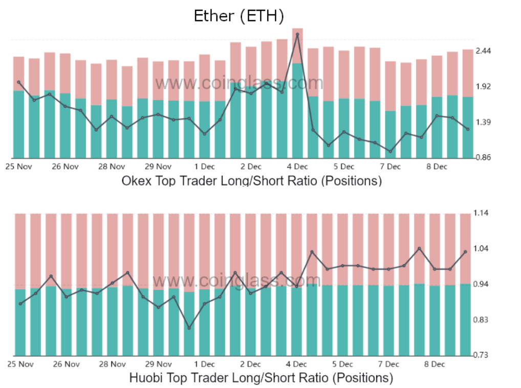 Bu arada, Ether balinaları ve arbitraj masaları, uzundan kısaya 1,0'dan 1,16'ya geçtikten sonra 5 Aralık'tan itibaren olumlu bir duygu değişikliği gösterdi. 25 Kasım'daki ortalama veriler karşılaştırırken, en büyük Ether yatırımcılarının uzun kısa vadeli işlemleri 1,43'ten yüzde 20 düştü.