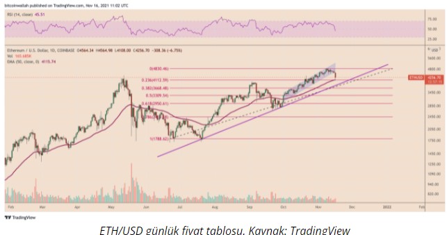 ETH, Bitcoin (BTC) ile birlikte tüm kripto para piyasasında gözlenen düzeltme sürecine ayak uydurdu ve salı günü yüzde 10 düşüş yaşayarak 4.100 doları gördü. Bu esnada Ether, dördüncü çeyrekteki yükseliş trend çizgisinin desteğinin altına geriledi.