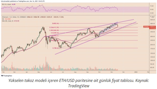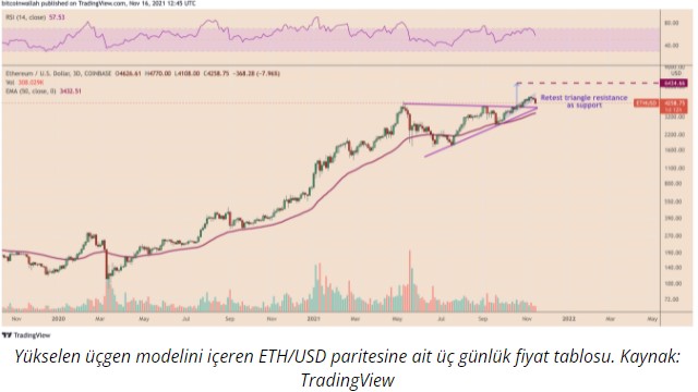 Dolayısıyla, ETH fiyatı üçgen direncinin hesaplandığı 4.000 dolara geri çekilme yaşanabilir ki bu alan aynı zamanda yükselen takozun alt trend çizgisi. Eğer geri çekilme yaşanır ve fiyat toparlanırsa 6.500 dolara kadar yükseliş gözlenebilir.