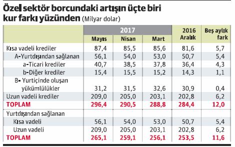 Kur farkı kısa vadeli borcu ise çok az etkilemiş durumda. Özel sektörün yurt dışından sağladığı krediler ilk beş ayda 5.4 milyar dolar arttı ve bunun yalnızca 281 milyon doları kur farkından kaynaklandı.