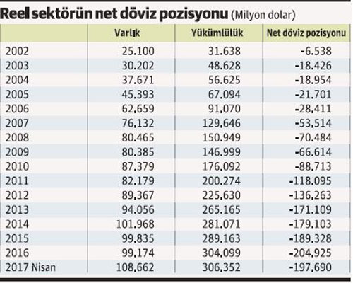 Sektör firmalarının toplam döviz pozisyonu açığı nisan itibariyle 197.7 milyar dolar düzeyinde ama vadesi bir yıl içinde gelecek net döviz pozisyonunda açık değil fazla var.