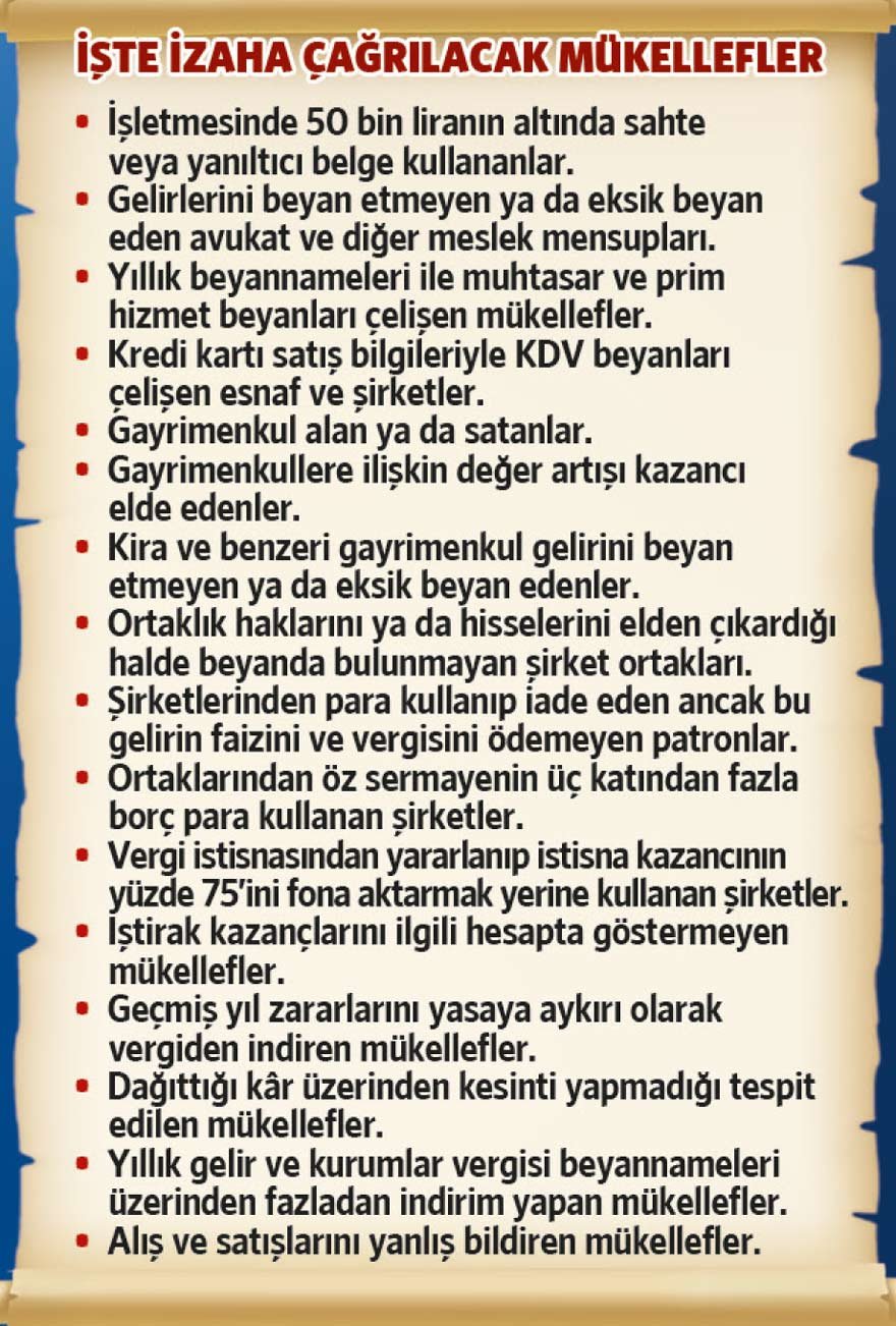 Maliye Bakanlığı, vergi kaçırdığından şüphe ettiği tüm mükellefler hakkında inceleme başlatmadan önce izaha çağırıp açıklama isteyecek. Açıklamaları ve belgeleriyle Maliye'yi ikna eden mükellefler cezadan kurtulacak. Açıklamaları yeterli bulunmayanlar ya da izahıyla vergi kaçırdığını bir anlamda itiraf eden mükellefler ise borçlarını 15 gün içerisinde ödemeleri halinde yüzde 20 oranında ceza ödeyip vergi incelemesinden kurtulacak. Yeni düzenleme özellikle gayrimenkul alım satımlarını gerçek değeri üzerinden beyan etmemiş milyonlarca vatandaşı yakından ilgilendiriyor.