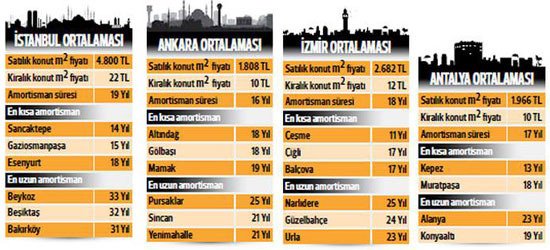 İdeal beklenti İstanbul gibi büyük şehirlerde bir evin kirasına göre 20 yılda geri dönmesidir. Ama birçok koşula göre bu süre değişir. Peki şu anda acaba evler ne kadar süre içerisinde amorti ediliyor. Bu konuyu da işin uzmanı olan Hürriyet Emlak’a sordum. Ellerindeki derin veri analizine bakıp 5 ili masaya yatırdılar. Sonuçlar enteresan. İstanbul’da en çabuk geri dönüş sağlayan ilçeler Sancaktepe (14 yıl), Gaziosmanpaşa (14 yıl), Esenyurt (14 yıl). Ev yatırımım dönsün diye neredeyse ömrünüzün yarısını bekleyerek geçireceğiniz ilçe ise Beykoz. Alanya’da bir evi kiraya verip satın aldığınız bedeli karşılamak için 23 yıl sabretmeniz gerekiyor. Kepez de ise bu sadece 13 yıl sürüyor. Demek ki Kepez’de kiralar pahalı evler ucuz...