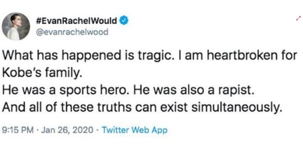 Rachel Wood paylaştığı tweette, “Bu olanlar trajik. Kobe’nin ailesi için çok üzgünüm. O bir spor kahramanıydı. Aynı zamanda da tecavüzcüydü. Ve bütün bu gerçekler aynı anda varolabilir” dedi.