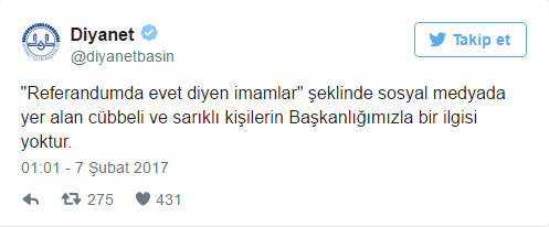 Diyanet İşleri Başkanlığı'nın resmi Twitter hesabından yapılan açıklamada, "'Referandumda evet diyen imamlar' şeklinde sosyal medyada yer alan cübbeli ve sarıklı kişilerin Başkanlığımızla bir ilgisi yoktur." denildi.