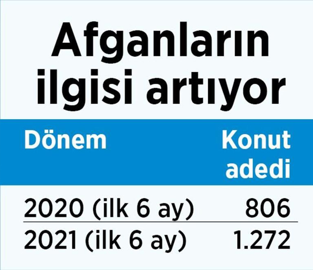 2020 yılının ilk 6 aylık döneminde Türkiye’den 806 adet konut alan Afganlar, 2021’in aynı döneminde ise 1272 konut aldı. Pandemiye rağmen alımları yüzde 60 oranında artış gösterdi.