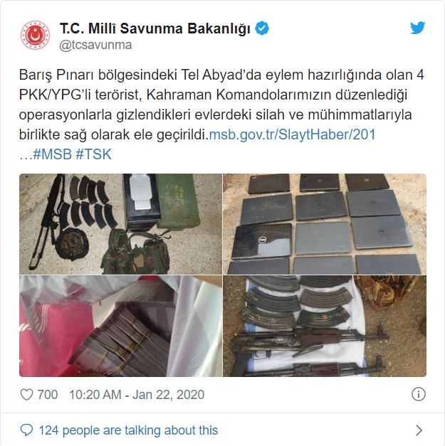 MSB, Tel Abyad'da eylem hazırlığındaki 4 PKK/YPG'li teröristin silah ve mühimmatlarıyla birlikte ele geçirildiğini bildirdi.