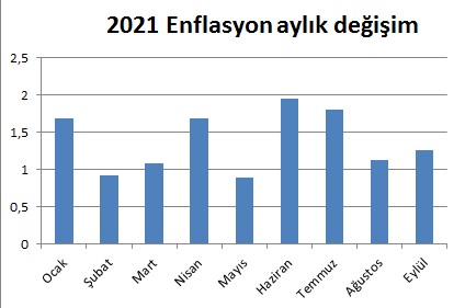 Türkiye İstatistik Kurumu verilerine göre, TÜFE, eylülde bir önceki aya kıyasla yüzde 1,25, geçen yılın aralık ayına göre yüzde 13,04, geçen yılın aynı ayına kıyasla yüzde 19,58 ve 12 aylık ortalamalara göre yüzde 16,42 arttı.